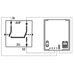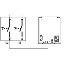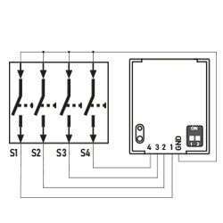 An den Einbausender RTS03 können vier handelsübliche Taster, zwei Schalter oder ein Jalousieschalter angeschlossen werden.